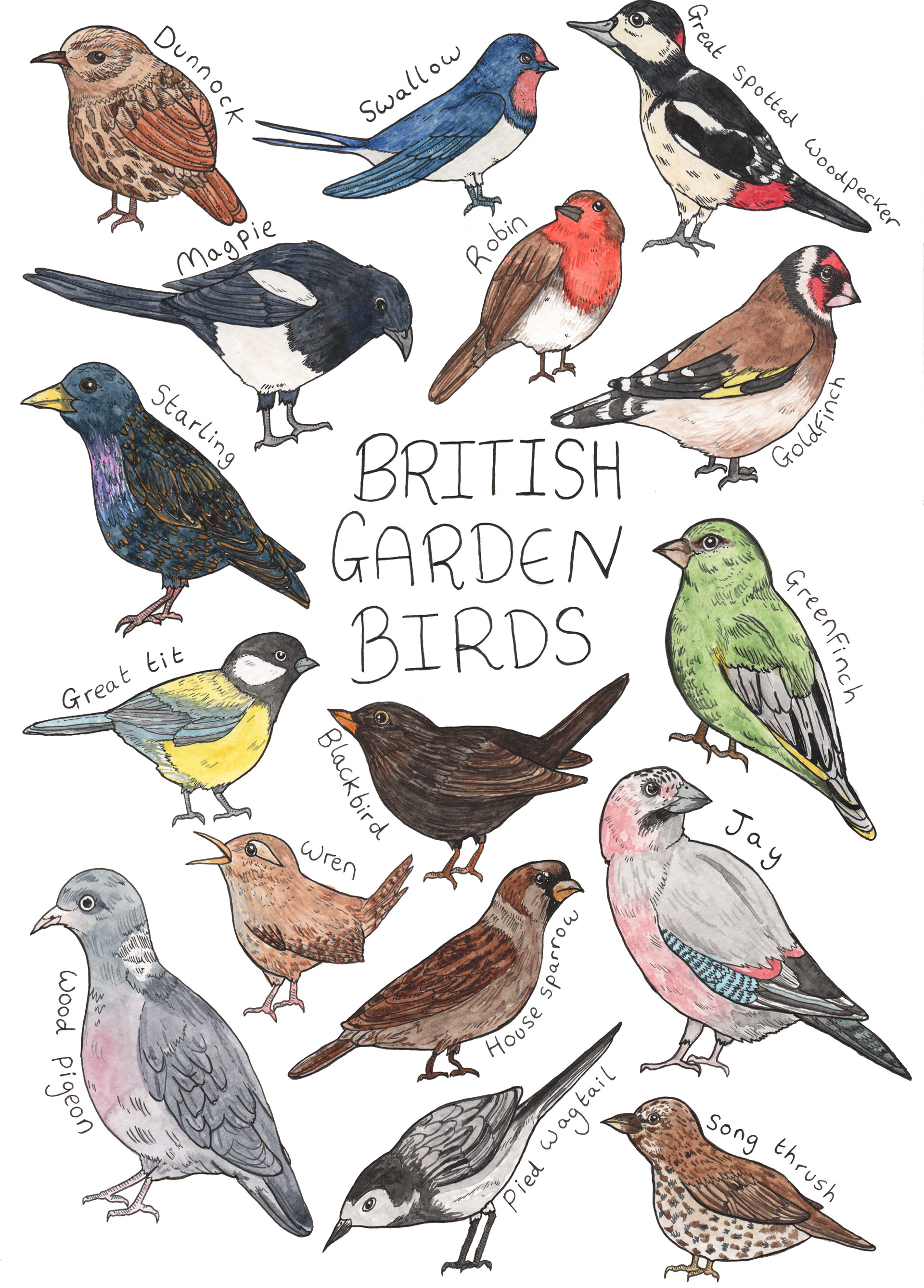 British bird identification key, done in watercolour paints.