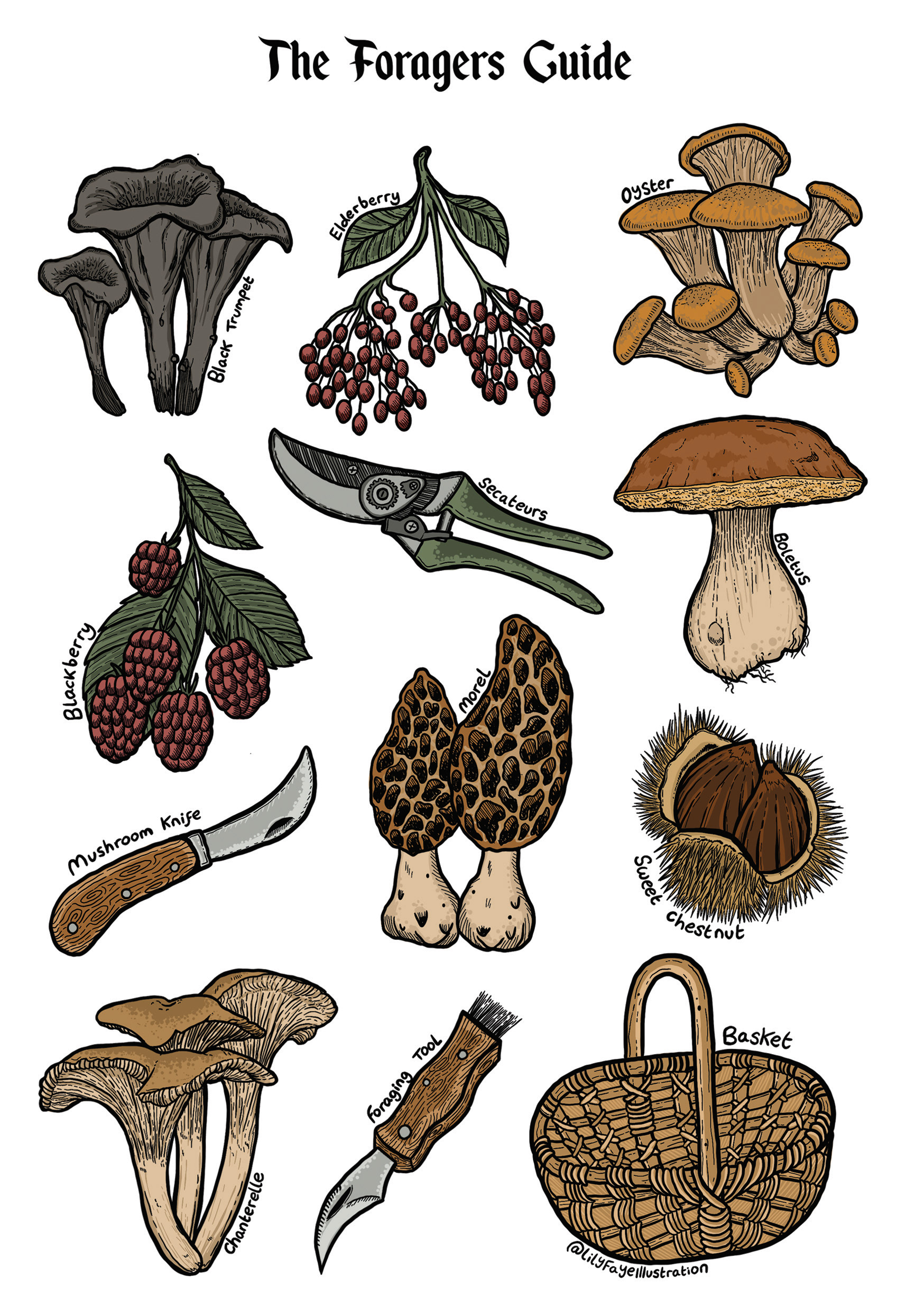 'The foragers guide' on various tools and different edible plants and fungi.