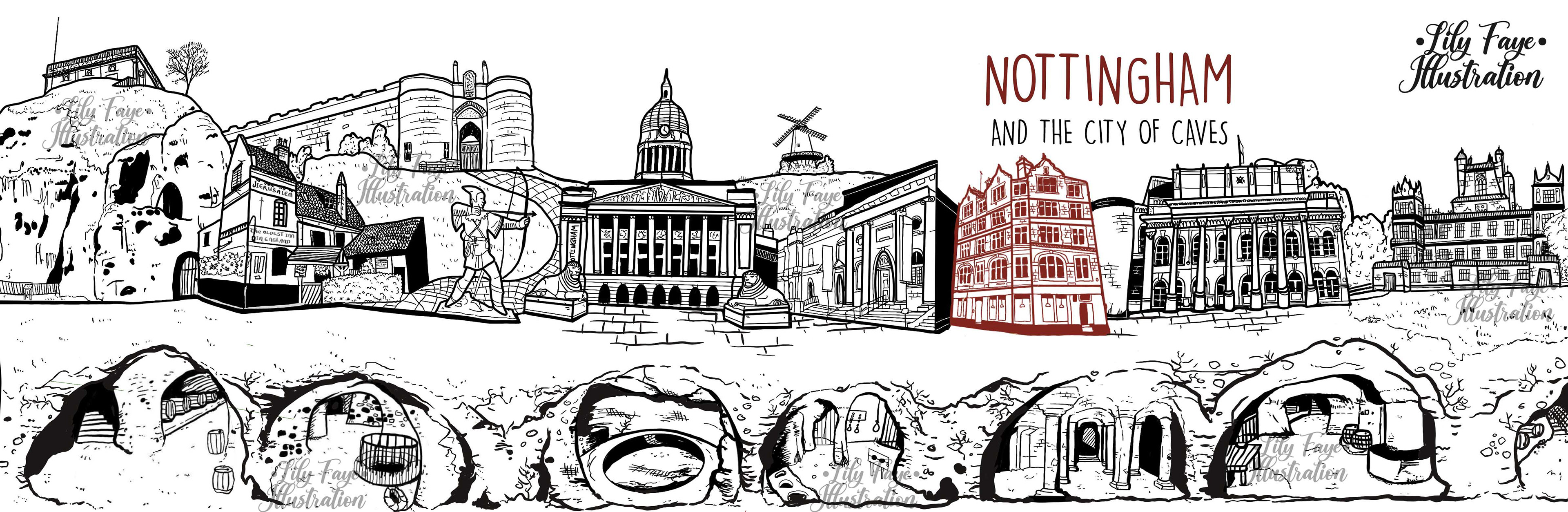 A commissioned illustration piece of Nottingham's landmarks and the cave system. Commissioned by Josephine's tea rooms (highlighted in red)