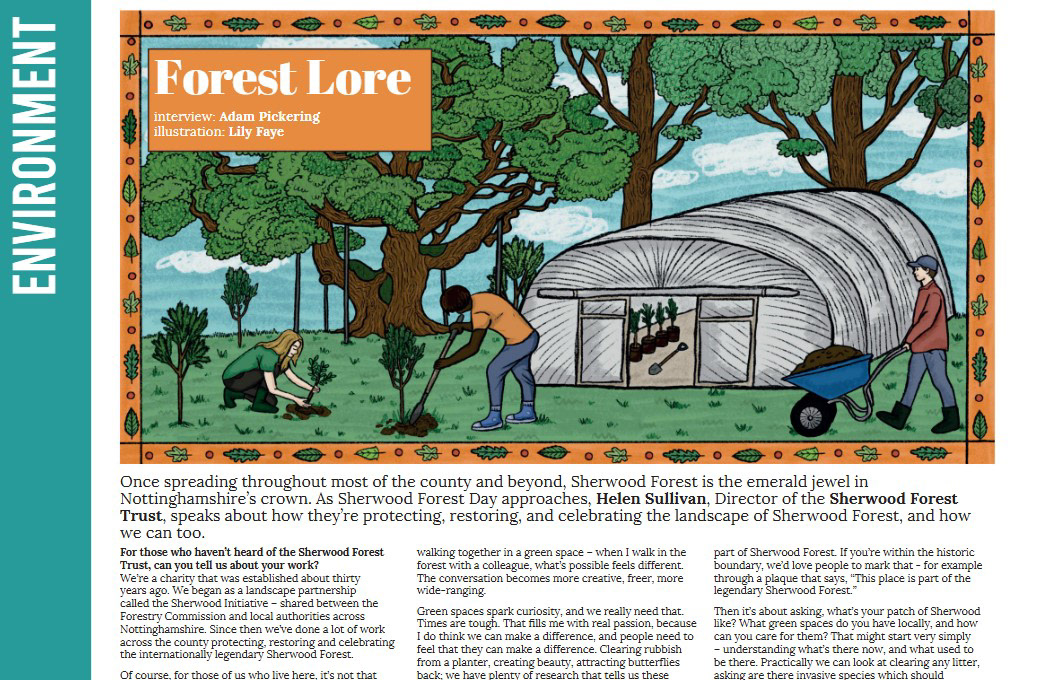Sherwood Forest Trust - An editorial illustration for an article interview on the conservation of the forest and a new tree planting nursery.